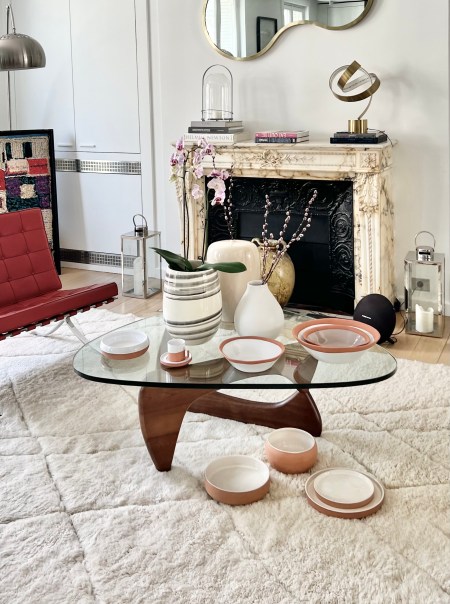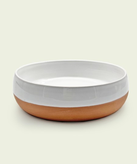 Saladier graphique bi-colore blanc émaillé bordé d’un contour en terre cuite brut terracotta.