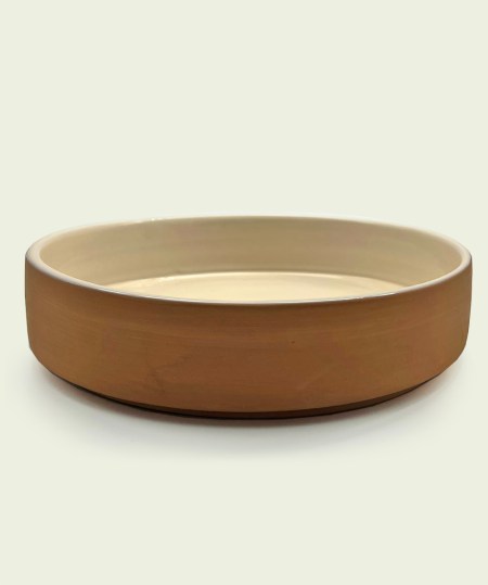 • Plat en terre cuite non traité de fabrication artisanale. La partie émaillée beige s’oppose à la matière brute de la terre. La texture brute donne de la subtilité et du caractère à ce plat. Il peut servir de plat de saladier ou de coupe à fruits.