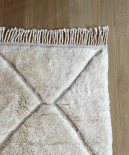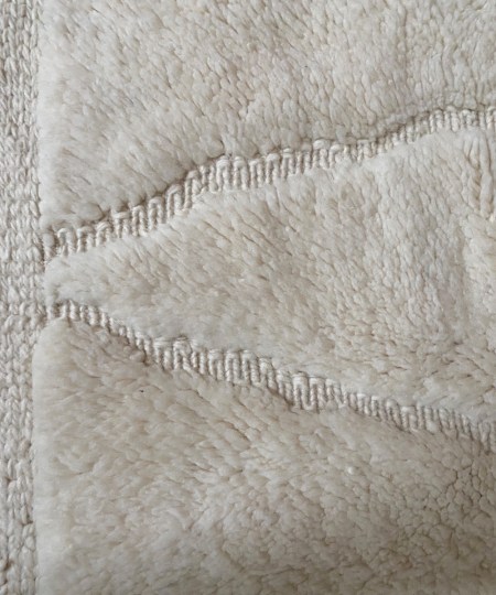Détails : Tapis creusé tel des lignes de tricots donnant un relief épais au tapis. Technique que l’on retrouve dans la région du Moyen Atlas sur les tapis Mrirt.