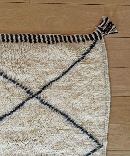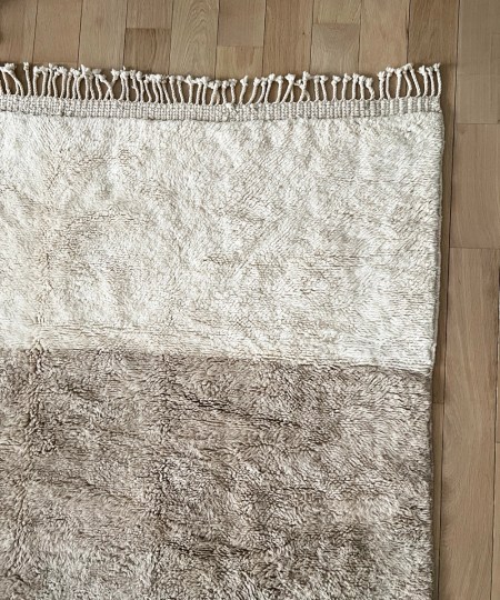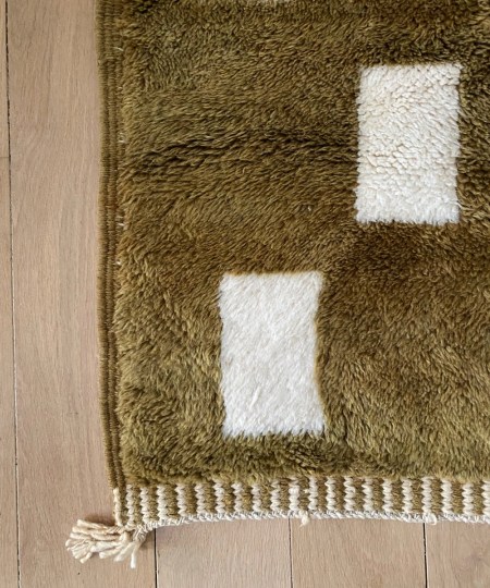 Détails : Creusé tel des lignes de tricot donnant un relief épais au tapis, technique que l’on retrouve dans la région du Moyen Atlas sur les tapis Mrirt. Bordure façon kilim, natte en laine tressée à la main.