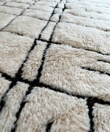 Détails : Ce tapis graphique est creusé de couleur noir tel des lignes de tricot, une technique que l’on retrouve dans la région du Moyen Atlas sur les tapis Mrirt.